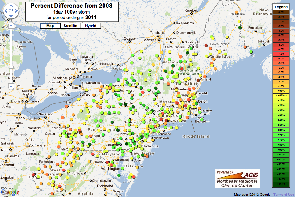 The ambitious goal of this project is to use the same methodology employed in NRCC 2011 to calculate extreme precipitation return periods for the past, and also allow for annual reanalysis as new years of rainfall data are made available. The results have been plotted as a series of maps and graphs, depicting the 1day storm amount at recurrences of 2, 5, 10, 25, 50, and 100 years. The analysis was repeated to create separate periods of record ending in each year from 1958 to present. This allows for analysis of trends, and examination of potential impacts due to climate change.